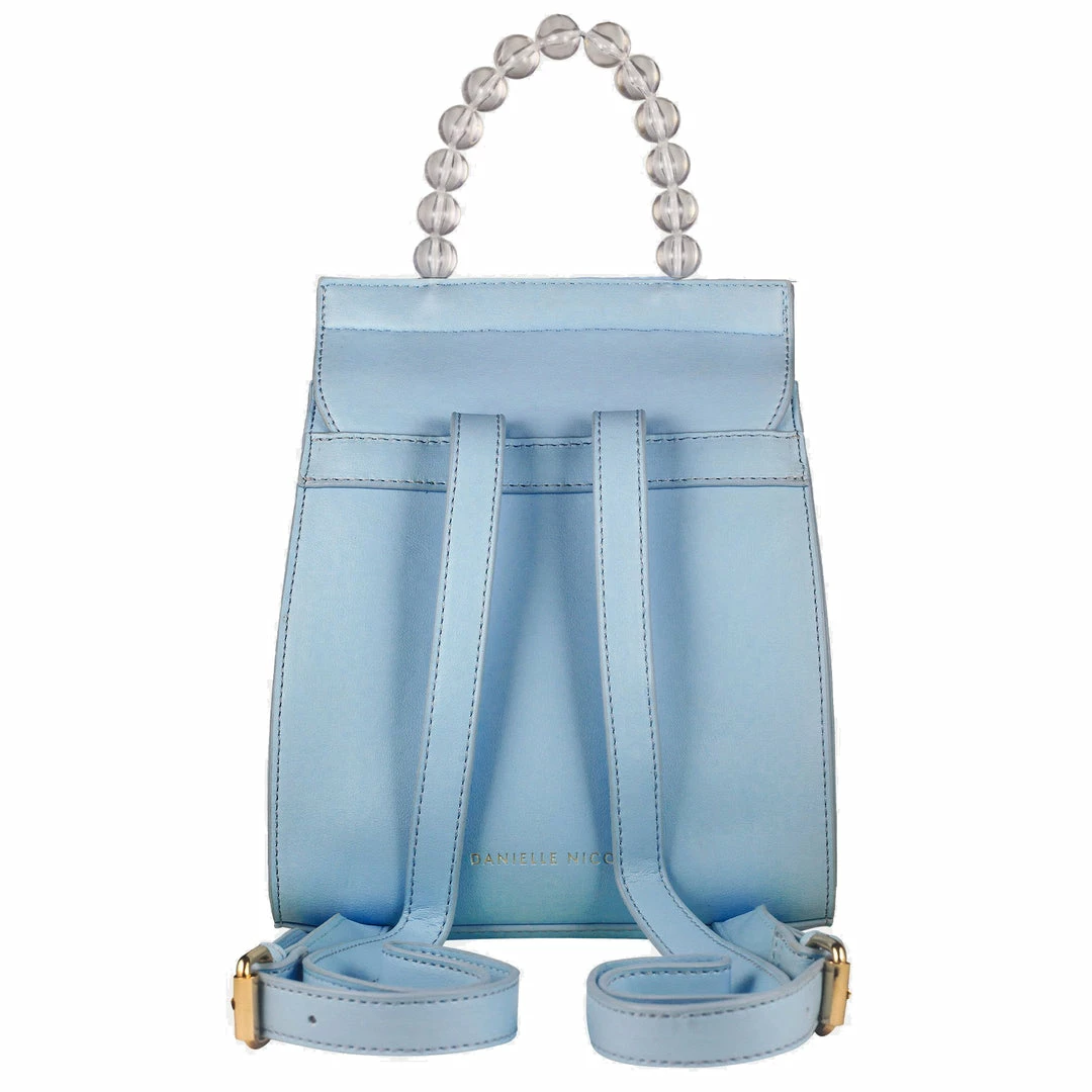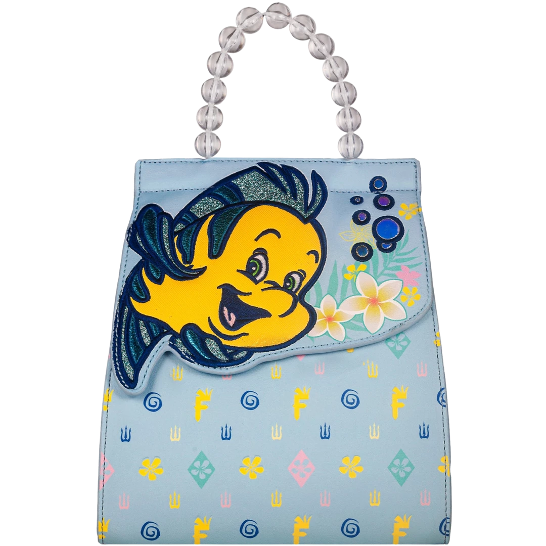 handle mimicking bubbles. Flounder is featured on the top flap, with a shimmery yellow base and blue metallic and glitter materials. This backpack has adjustable straps, and interior back wall zip pocket and front interior pocket. Flip your fins and get ready to make a splash in true mermaid style!
