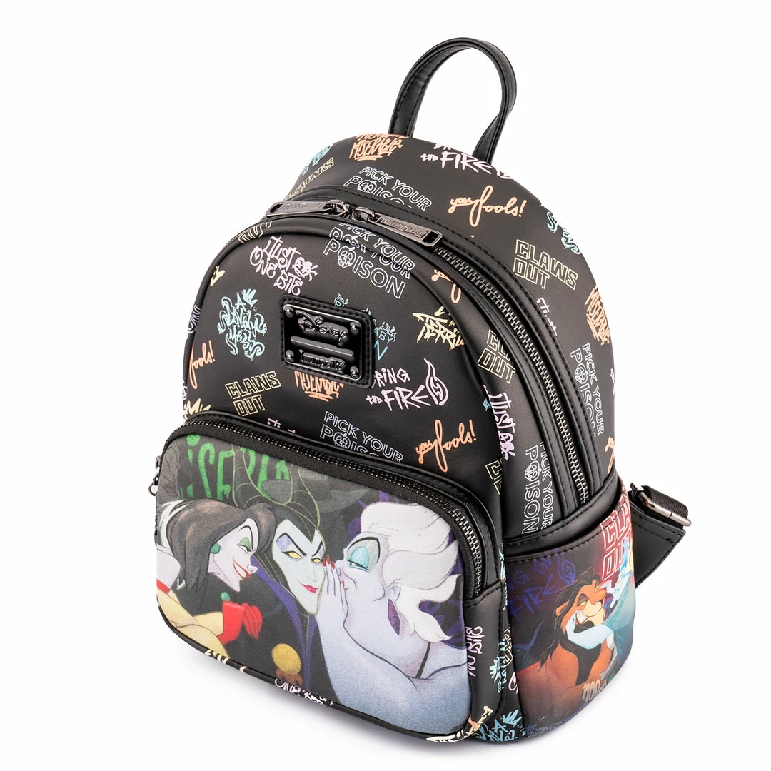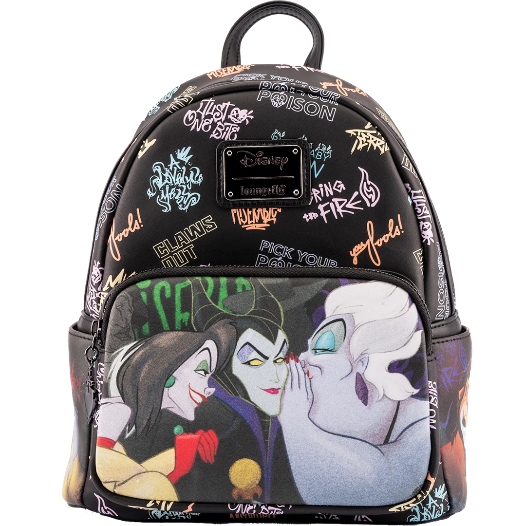 Dare to drop in on the Disney Villains Club. What secrets could the likes of Maleficent, Ursula, and Cruella de Vil be keeping? As a fly on the wall, you can listen in, while your possessions remain safe inside the Loungefly Villains Club Mini Backpack.