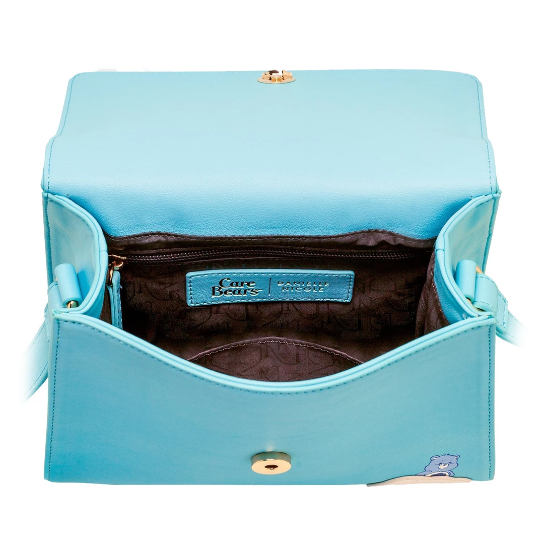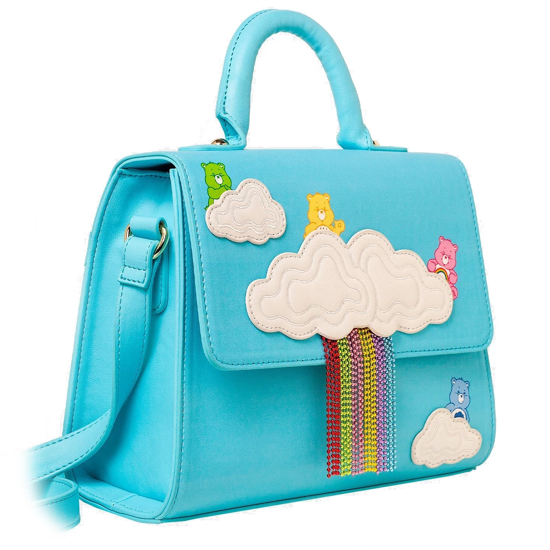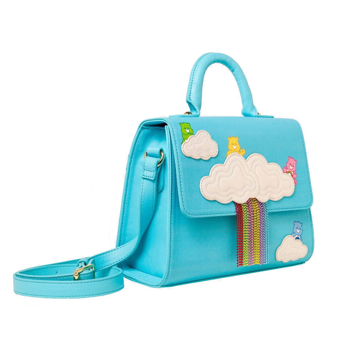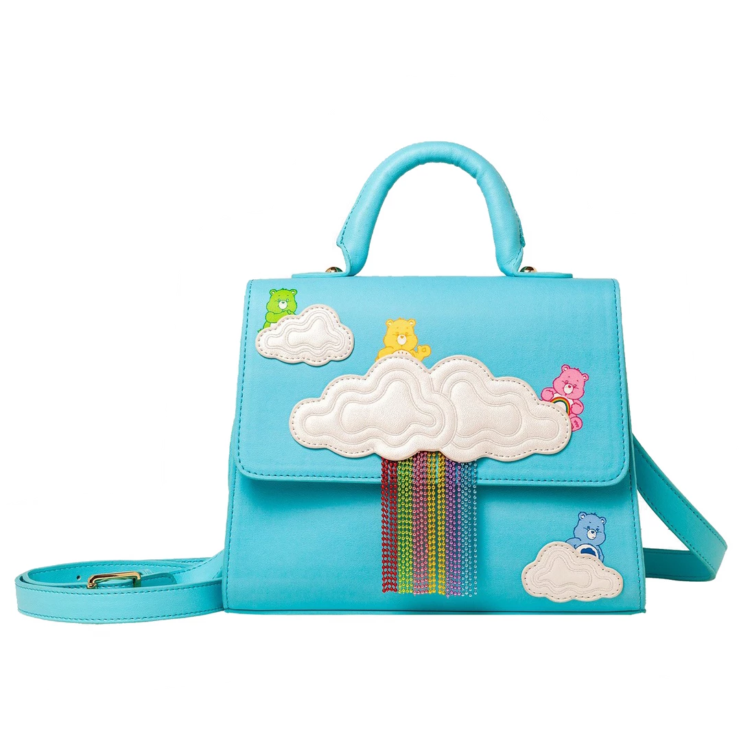Incorporating bright colors and whimsical details to your looks, this crossbody showcases dreamy clouds, rainbow beaded fringe details, and the playful Care Bears crew. The crossbody has a light blue base, and plays with mixed media elements to bring out a high fashion aesthetic. Sure to go with any outfit, daydream in style with this statement piece. Features include an adjustable crossbody strap, an interior back wall pocket and front interior pocket.