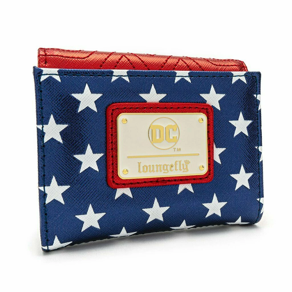 Loungefly’s classic Wonder Woman flap wallet has a beautiful sheen to it. This faux leather wallet includes printed, quilted and 3D metal rivet details.