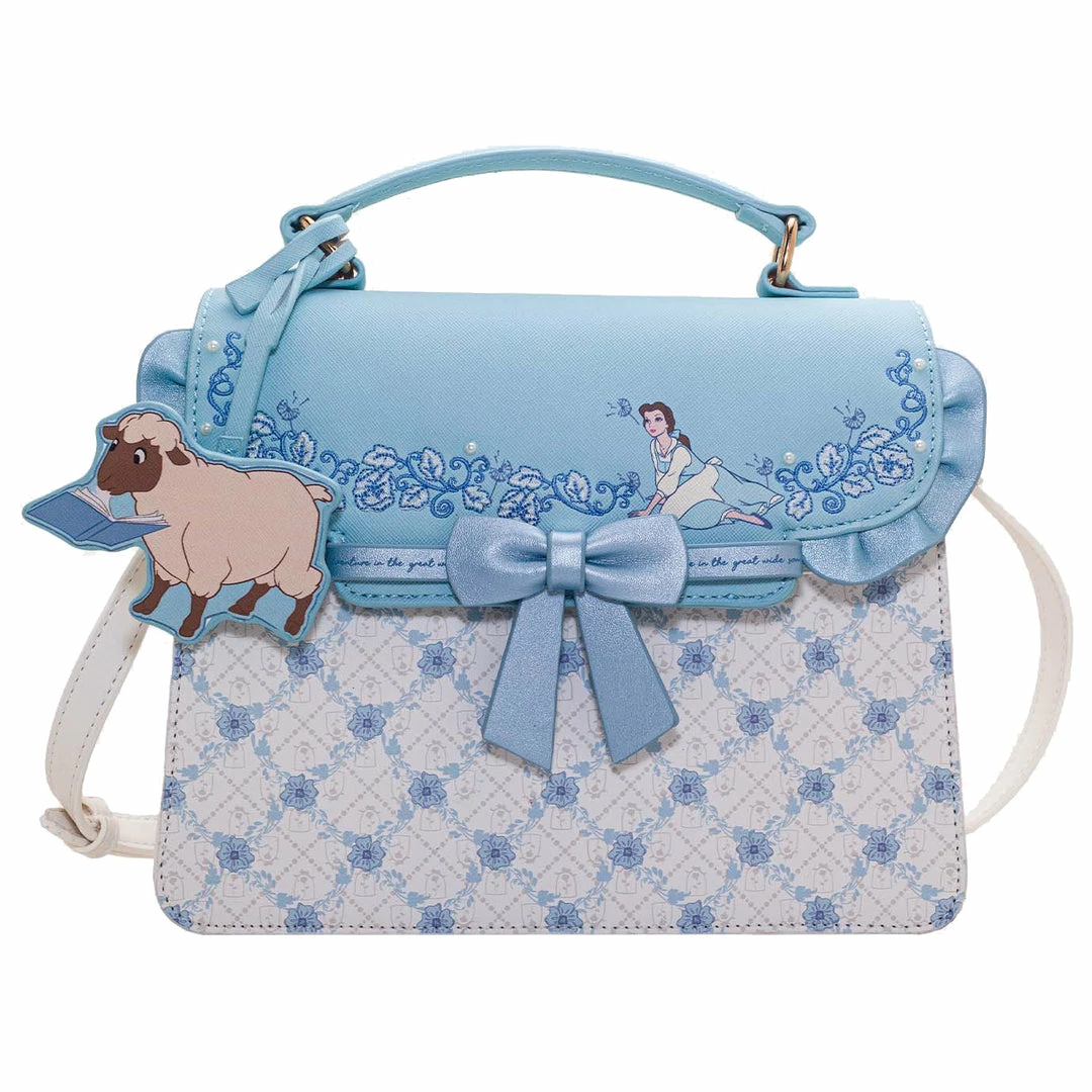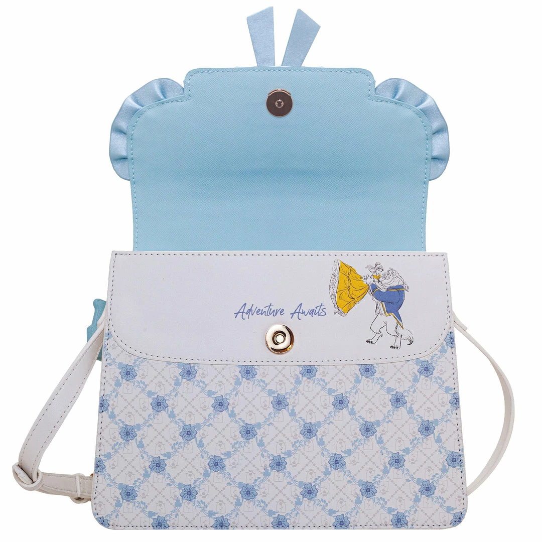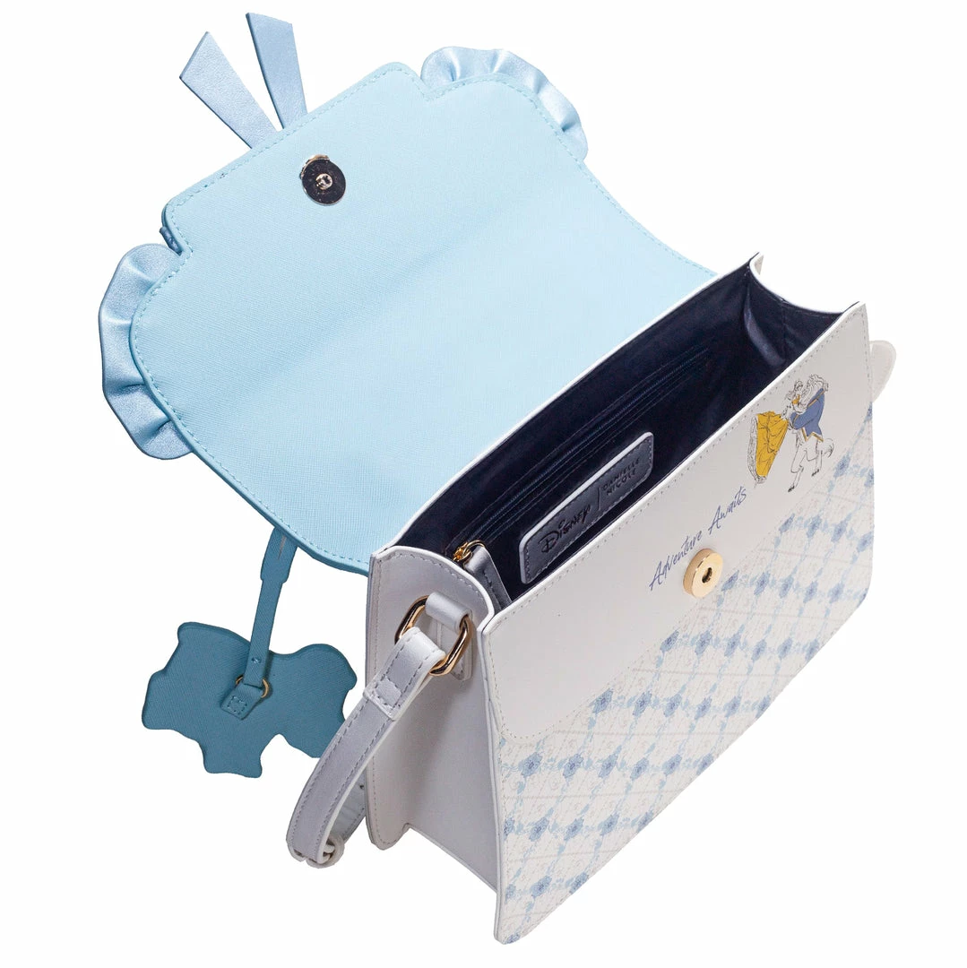 Adventure in the great, wide somewhere with this satchel inspired by Belle’s village outfit. A custom monogram, light blue print decorates the white base. The front flap features Belle, baroque accents, and a dandelion bouquet that will transport you to the hills of Belle’s quiet village. This satchel can be carried as a statement piece, and also includes a crossbody strap to go hands-free.