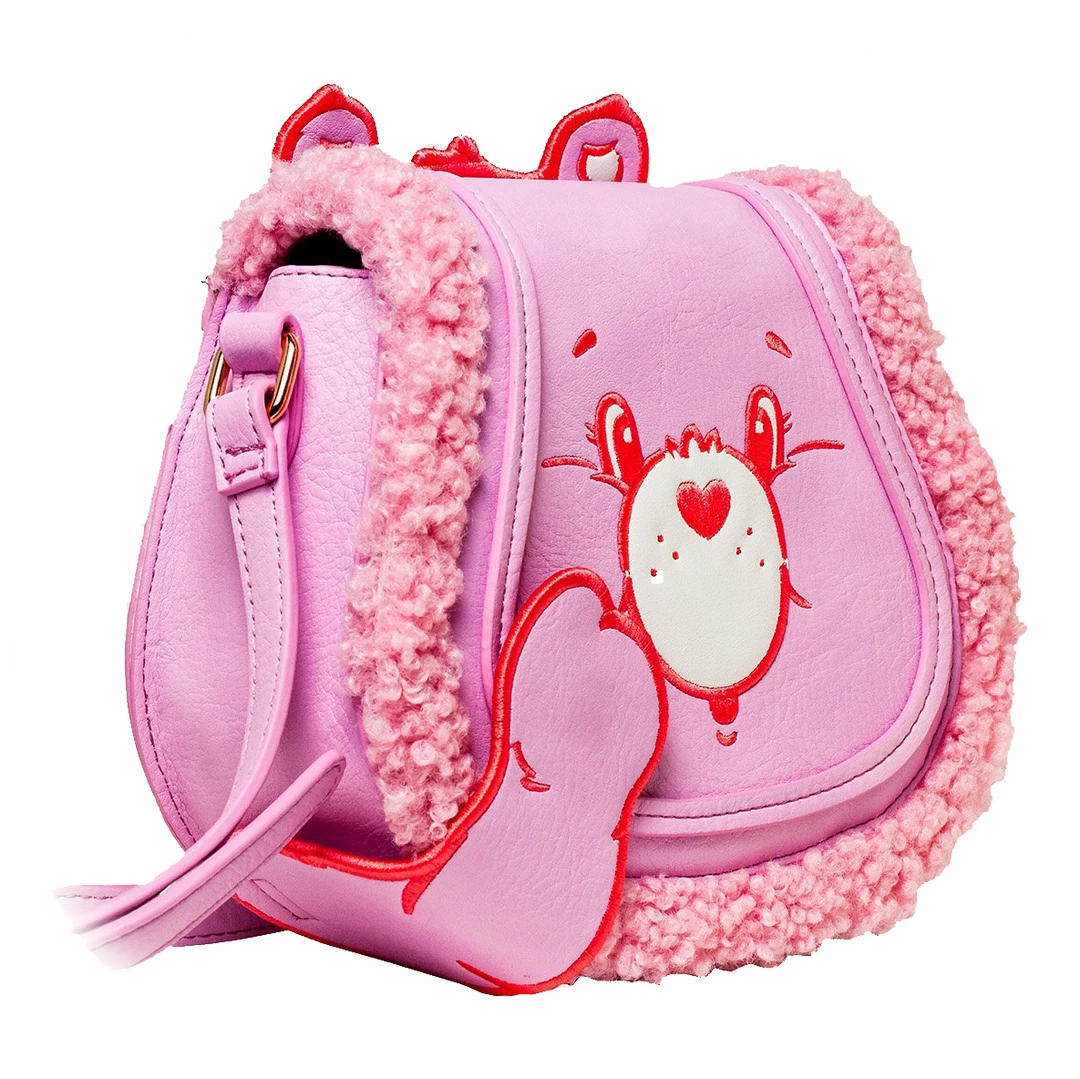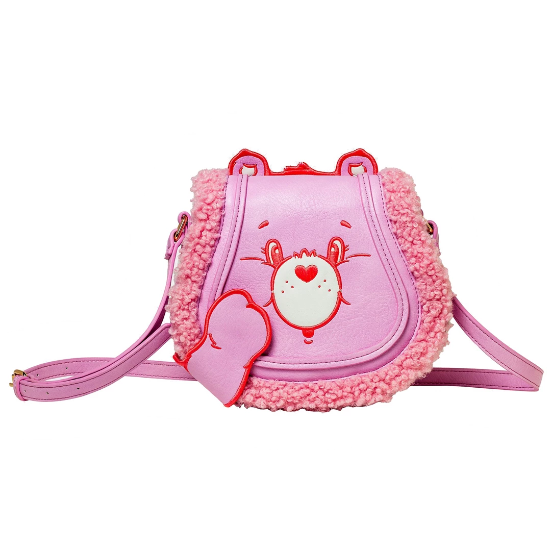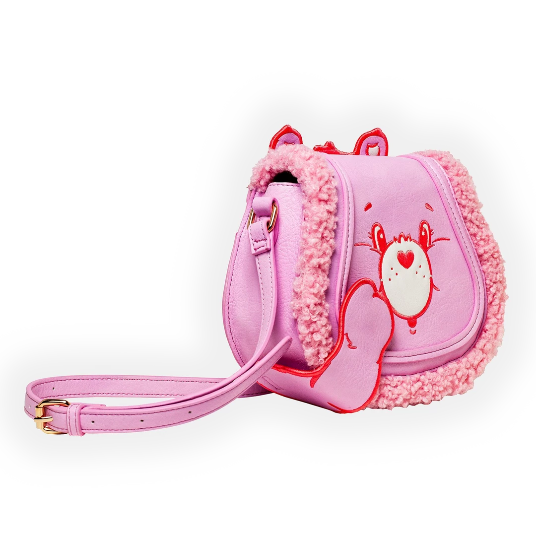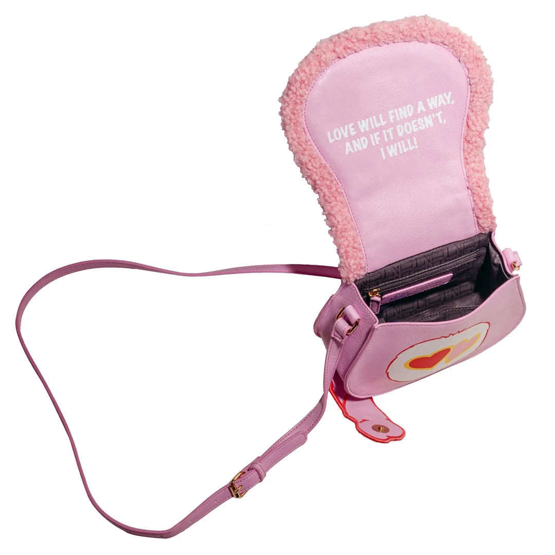 Romantic and charming, mixed with a little bit of sass as well, our Love-A-Lot Bear Crossbody is a year-round bag that will add a pop of color to your outfit. Incorporating feminine shades of pink with faux fur shearling trim, the mixed media elements gives this Care Bear a fashion forward design. Reveal this bear’s special message when you lift the flap! Find Love-A-Lot’s signature quote, “Love will find a way and if it doesn’t I will!” Made for everyday wear, this crossbody has an adjustable strap to fit you accordingly.