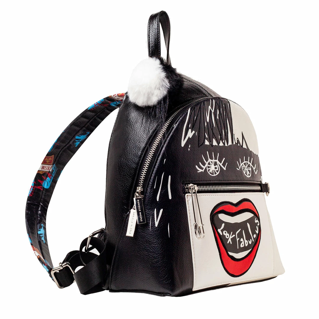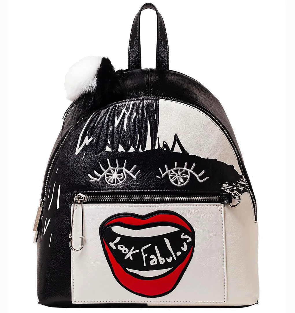 Always look fabulous with this chic and edgy backpack, inspired by the villainous diva, Cruella de Vil. Featuring bold pops of red against a black and white pearlized finished base, the words “Look Fabulous” embroidered between sassy red lips, and a hanging pom pom detail. This backpack also has adjustable straps and a front zipper pocket with a customized pin zipper puller. Bring this bold piece with you wherever you go, adding a touch of daring drama to your outfit.