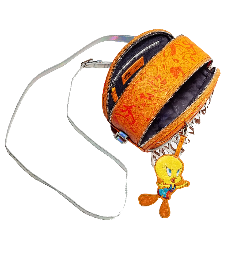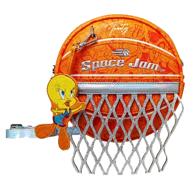 Slam Dunk! Celebrate your love for the Looney Tunes with this special edition Space Jam 2 Basketball Crossbody! A round basketball silhouette featuring a Toon Squad print on the basketball with a removable Tweety dangle, and a silver metallic net. Get ready to make sure you bring your “A’’ game to the fashion scene, while also staying organized! This bag features 2 zipper compartments for all your necessities. With an adjustable crossbody strap so you can perfect its fit, this collectible piece is the statement bag you’ll reach for over and over.