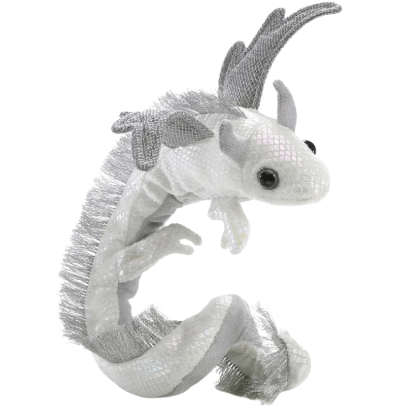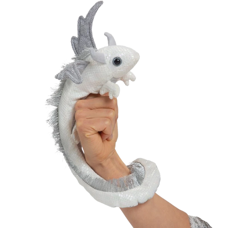 The Folkmanis® Pearl Dragon Wristlet dazzles and shines as wearable art or puppet jewelry. This exquisite pearlescent Finger Puppet is perfect for cosplay, imaginative play, and storytelling. Magnets in tail secure the dragon at the wrist.