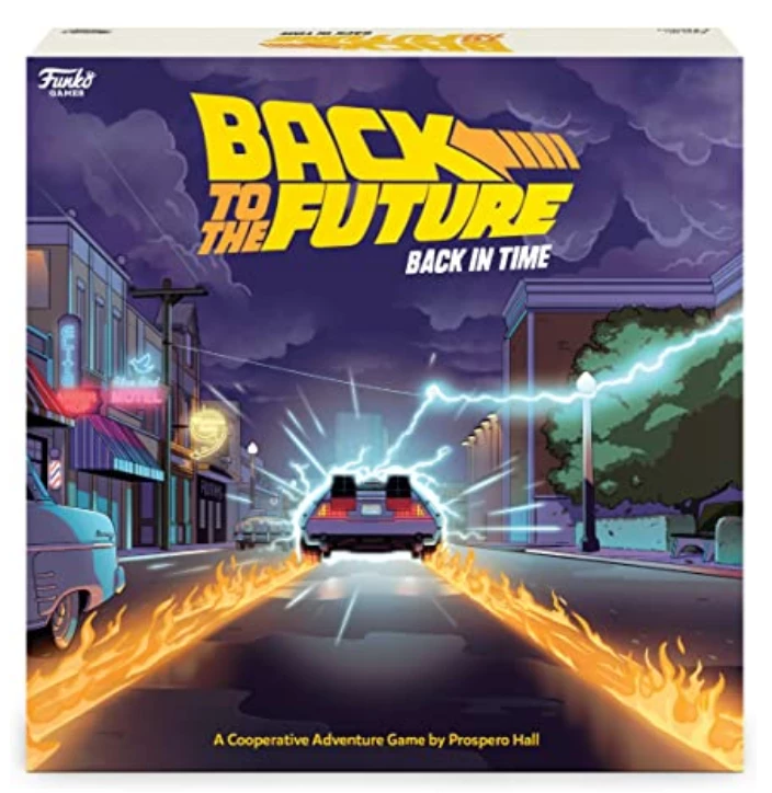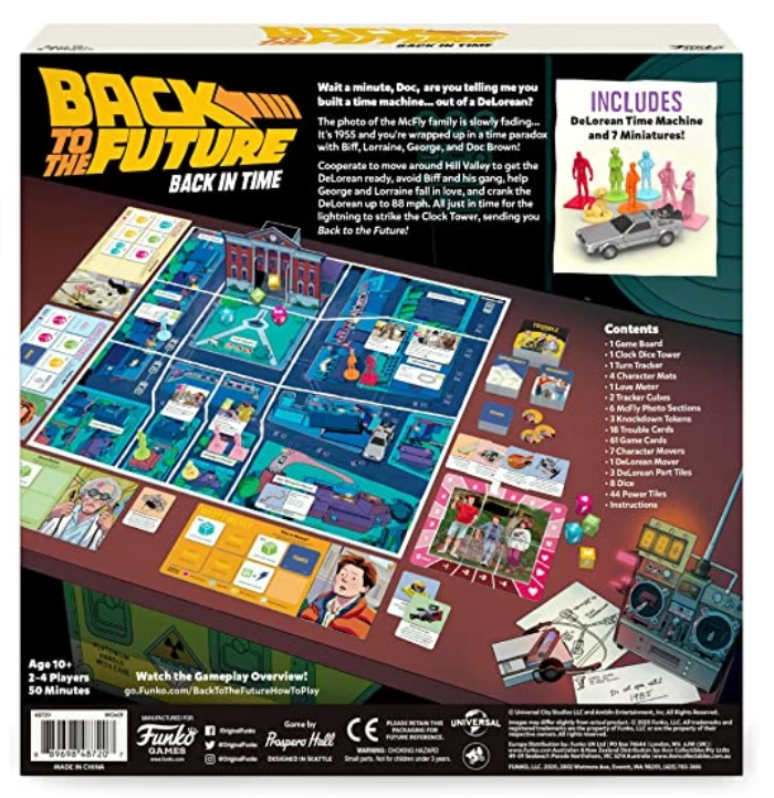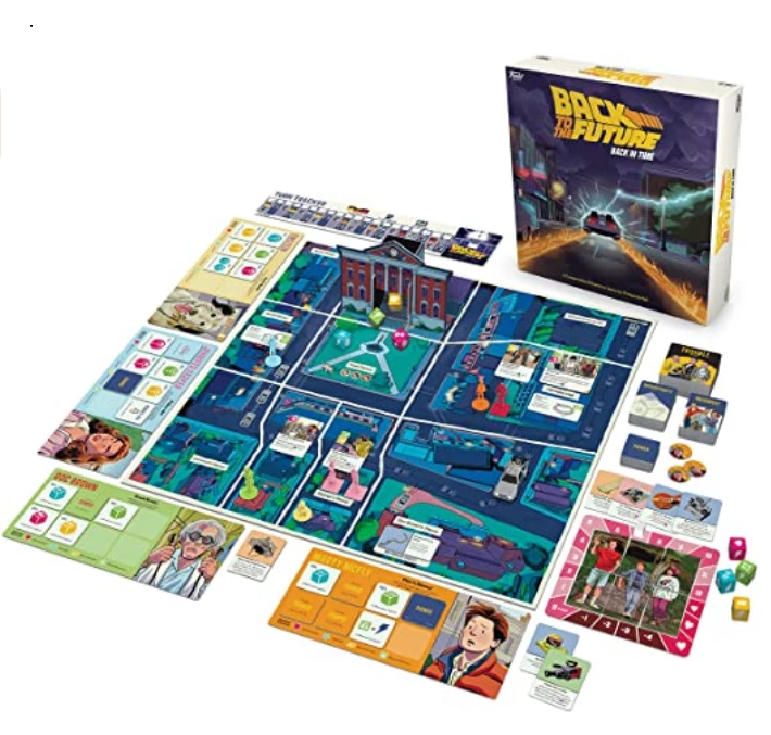 In the fully co-operative game Back to the Future: Back in Time, each player takes on the role of a major character from the movie: Marty McFly, Doc Brown, Jennifer Parker, or Einstein the dog. The objective of the game is to have the characters move around 1955 Hill Valley, collecting certain items in an effort to fix Doc’s famous DeLoreon time machine, defeat Biff Tannen and his gang of trouble-making friends, while ensuring that Marty’s parents fall in love. Only when that is accomplished can players then accelerate the DeLoreon to 88 MPH down Main Street before the clock tower strikes 10:04 pm!
