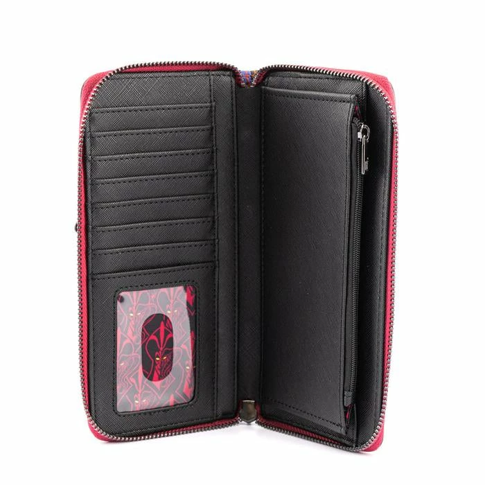 The Disney Aladdin Jafar Villains Scene Zip Around Wallet is made of vegan leather (polyurethane). Wallet zips closed, has sturdy metal hardware, and features: applique, debossed, and printed details. Take note of the coordinating pattern of the inside lining fabric