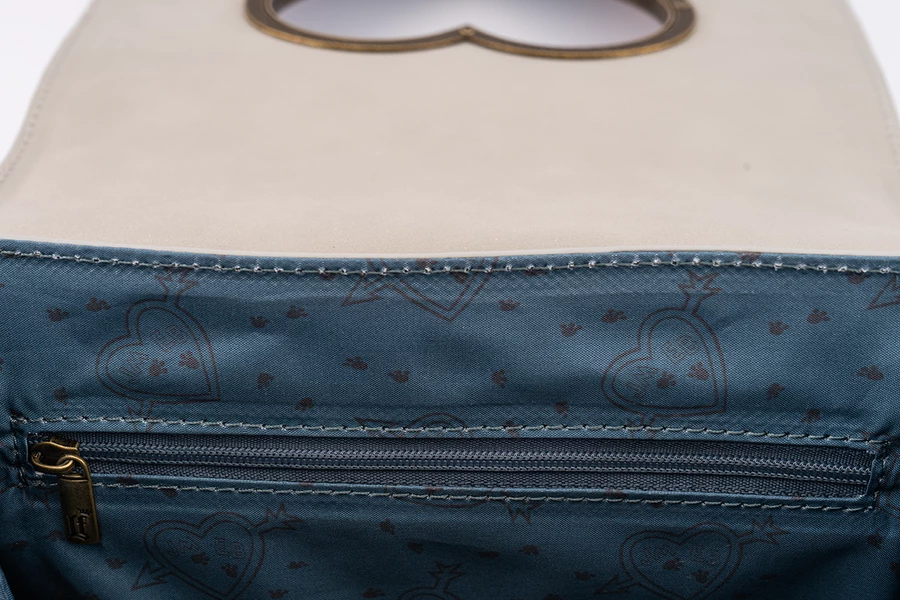 The Loungefly Lady and the Tramp Crossbody Bag is made of vegan leather (polyurethane). Bag has a detachable bag handle, adjustable shoulder strap (detachable), sturdy metal hardware, and features: molded metal cutout, debossed, and printed details. Take note of the coordinating pattern of the inside lining fabric. This bag is an officially licensed Disney product.