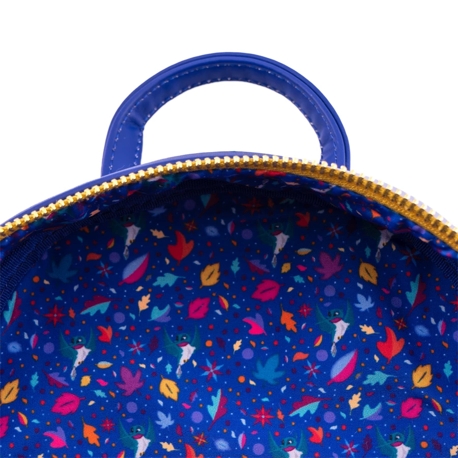 Capture a glimpse of the beauty of nature with Loungefly’s Pocahontas Just Around the Riverbend Mini Backpack. In the distance a rainbow beams through the trees, as Pocahontas canoes down the river with Meeko and Flit. It’s a beautiful bag to bring into your Disney wardrobe.