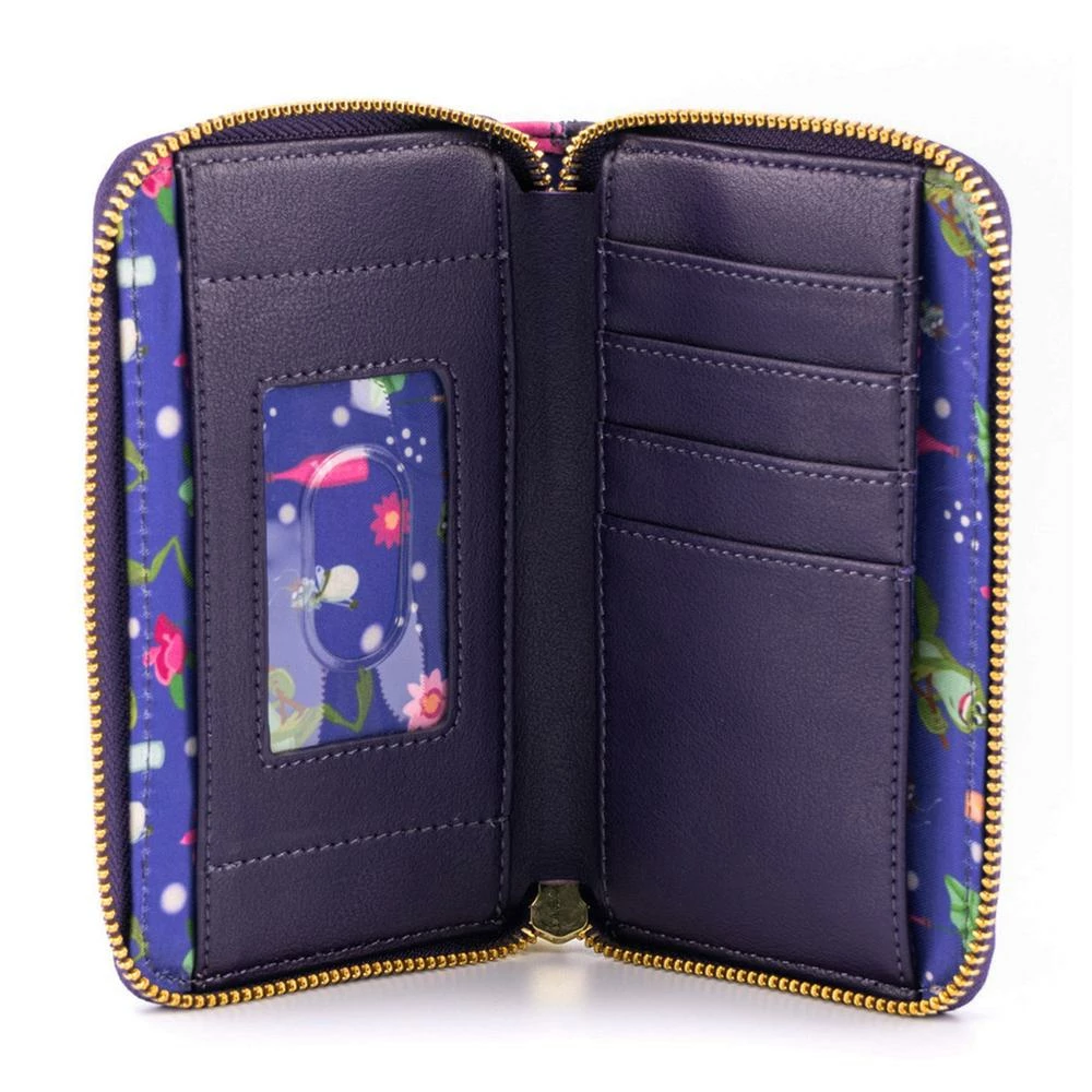 The Disney Princess & the Frog Tiana’s Palace Zip Around Wallet is made of vegan leather (polyurethane). Wallet zips closed, has sturdy metal hardware, and features: applique, and printed details. Take note of the coordinating pattern of the inside lining fabric.