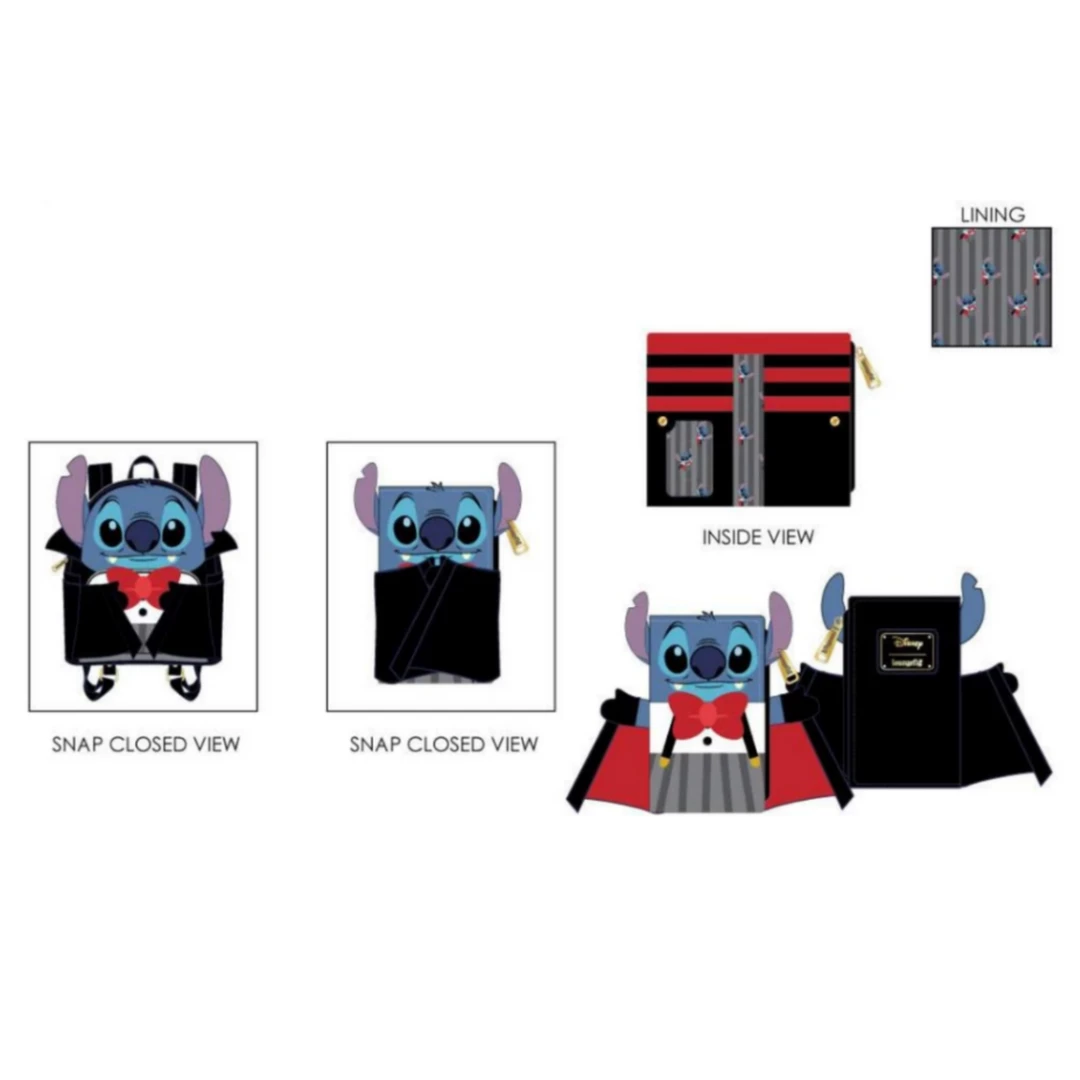 Stitch is dressed as a vampire to accompany you on your adventures this year as the Disney Lilo & Stitch Vampire Stitch Bow Tie Flap Wallet. This wallet is made to look like Stitch in his vampire costume, including his suspenders and bow tie. Stitch can hide in his cloak, or you can move his hands, to open his arms wide and reveal his costume.