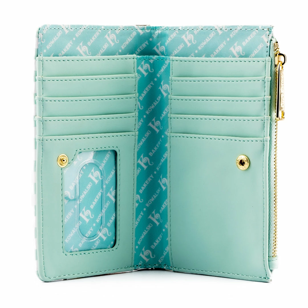 The front flap depicts the enticing Kowalski Bakery window-display of baked treats, with Newt Scamander standing outside, his magical case in hand. Note the coordinating sky-blue inside lining with a “K Bakery” white lettering motif. In addition to printed details, this bifold wallet features embroidered and debossed details, gold snaps and zippers to keep everything in place, along with vegan leather (polyurethane).