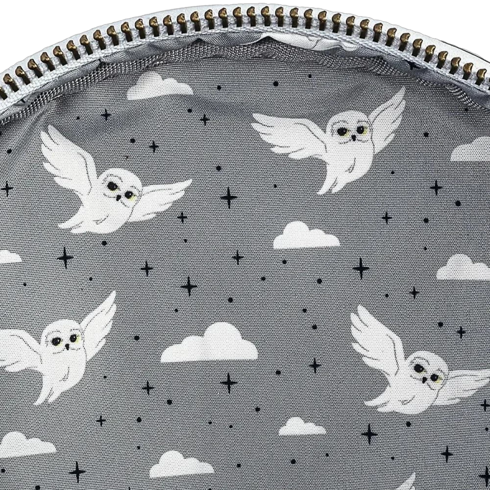 - Features: Front zipper pocket with Metal Charm zipper pull. Adjustable shoulder straps. Top carry handle. Hedwig Printed Fabric Lining.