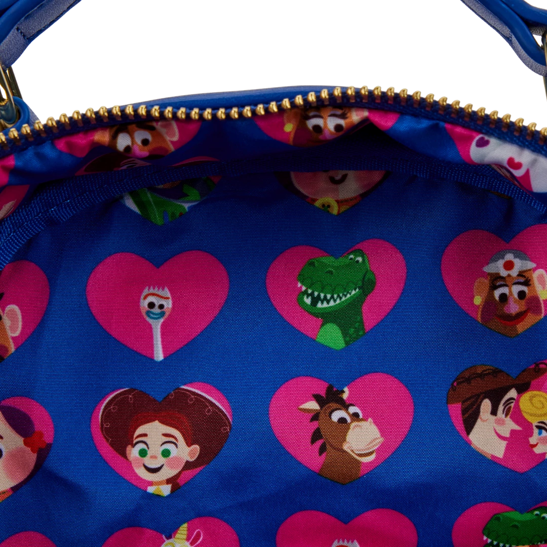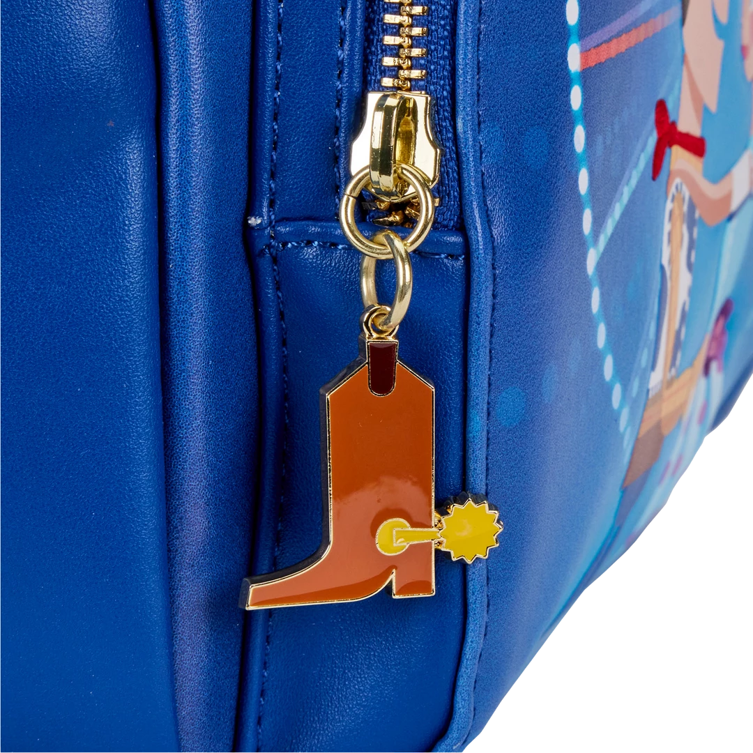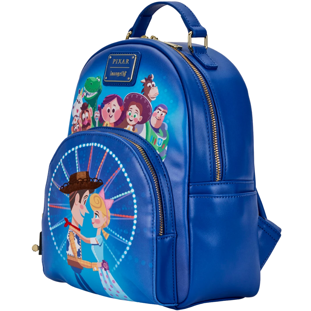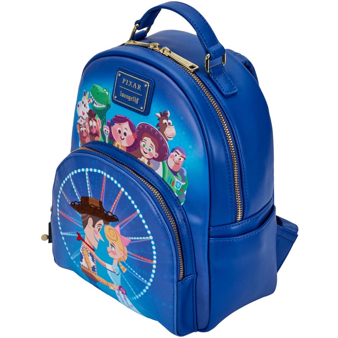 The wheels of fate are spinning in the amusement park, but Woody and Bo Peep manage to find each other. Celebrate this romantic encounter with the Toy Story Ferris Wheel Movie Moment Mini Backpack. On the front, Woody and Bo Peep gaze into each other’s eyes as they stand before the Ferris wheel, which sparkles at night. From above, several characters look down on the scene, including Buttercup, Mr. and Mrs. Potato Head, Rex, Karen Beverly, Bonnie, Jessie, Bullseye, and Buzz Lightyear. On the back, Slinky Dog and Hamm join Woody, Bo Peep, Jessie, Buzz Lightyear, Rex, and Bullseye as they make an encore appearance.