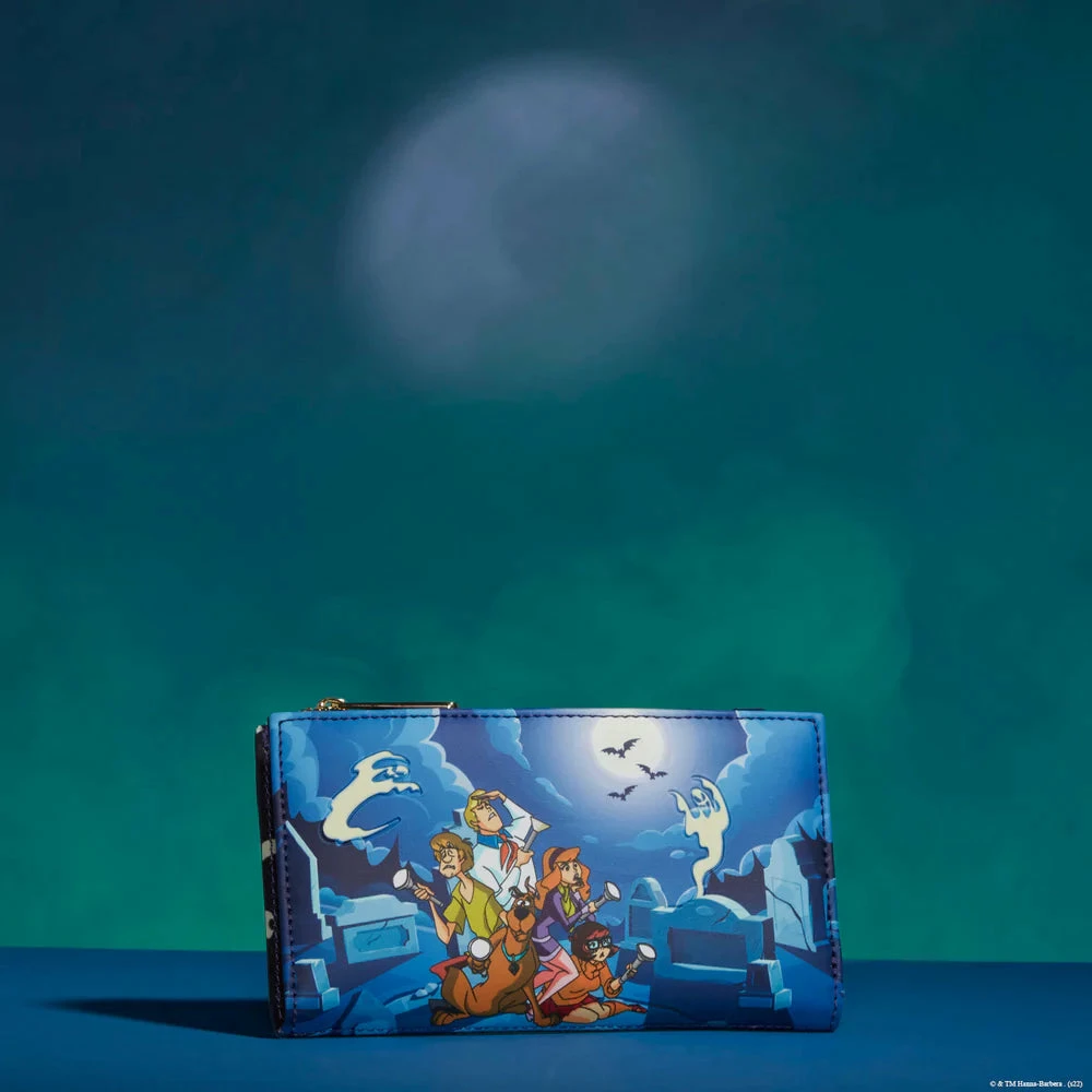 Zoinks! The Mystery Inc. Team is having one monster of an adventure! Help them unmask the villain—and keep your valuables safe—with this Scooby-Doo! Ghost Chase Glow in the Dark Flap Wallet. On the front, glow-in-the-dark ghosts surround Velma, Daphne, Fred, Scooby, and Shaggy on all sides. On the back, eyes glow in the dark, and a very frightened Scooby-Doo jumps into the arms of an equally frightened Shaggy.