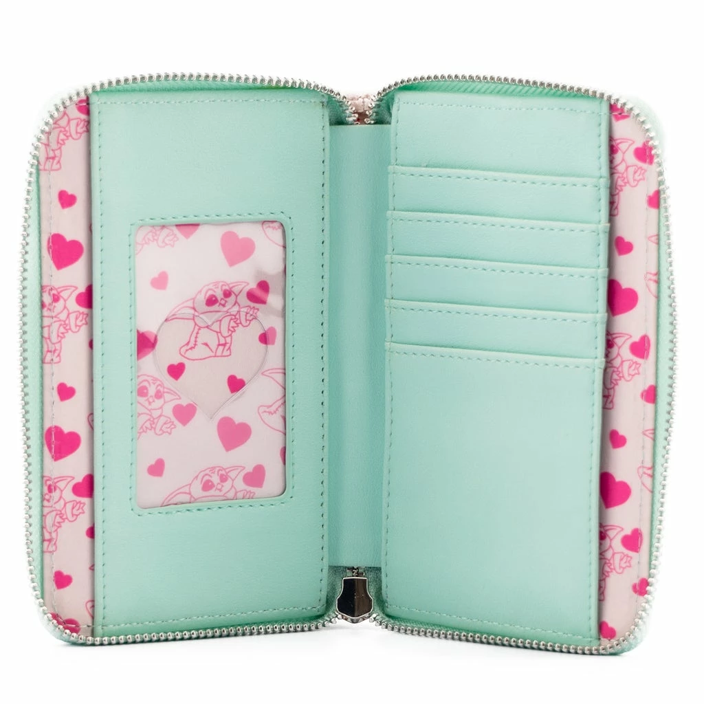 Share the love this Valentine’s Day with The Mandalorian Grogu™ Valentines Zip Around Wallet! The all-over-print is showered with pink and white hearts and the precious young Grogu in a variety of poses. Light green accents the pink and cream colors on the inside card slots. The wallet has 6 slots for holding cards, and a clear window slot for holding your ID. It’s a darling design that makes a great Valentine’s Day gift and addition to any Grogu collection.