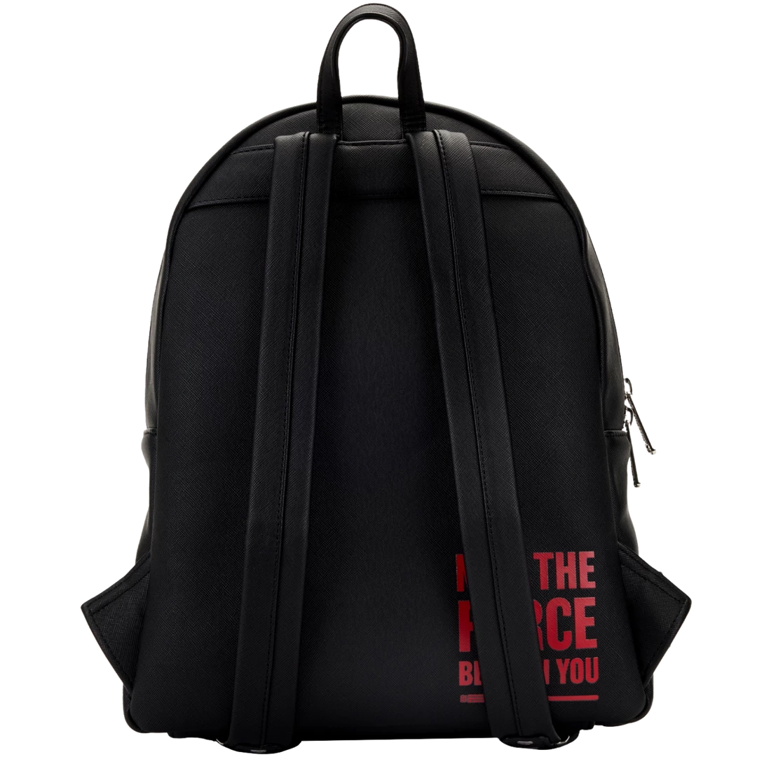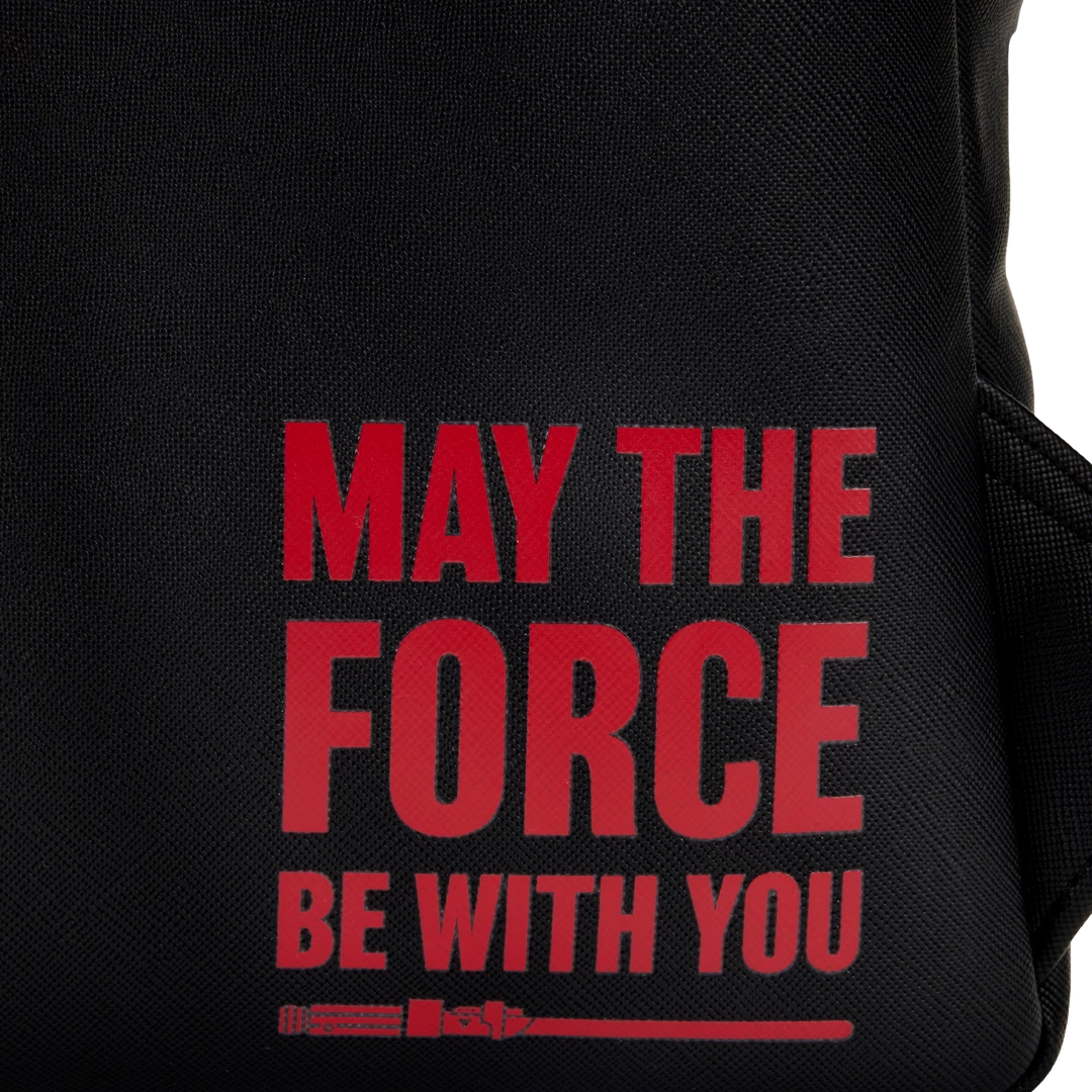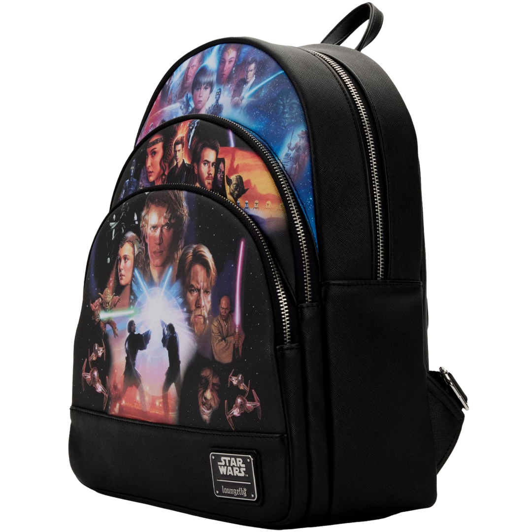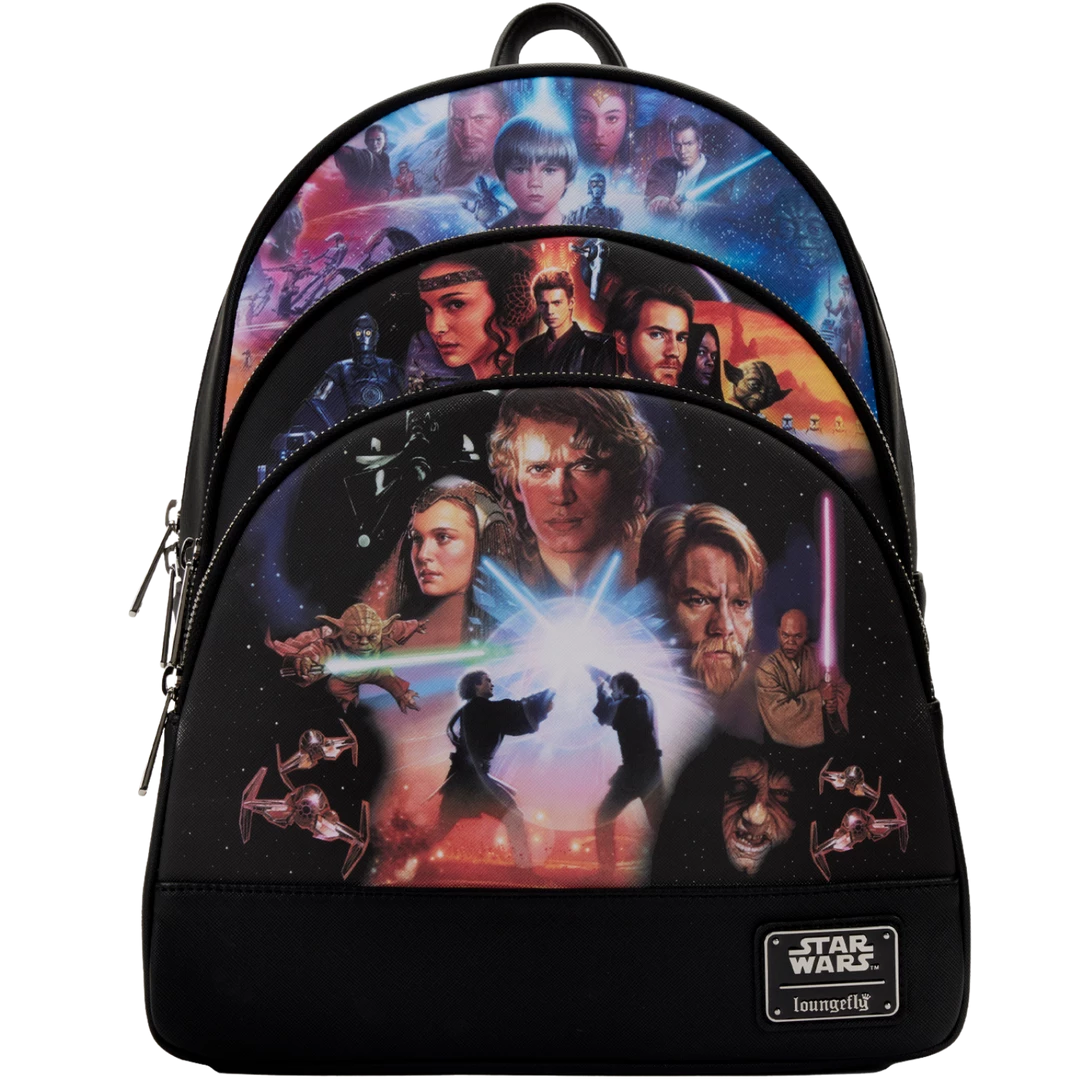 Shield your possessions with the power of the Force with this Star Wars Prequel Trilogy Triple Pocket Mini Backpack. Three zipped compartments on the front are dedicated to scenes from Star Wars movies including The Phantom Menace, Attack of the Clones, and Revenge of the Sith. On the back, the words “May the Force be with you” offer protection.