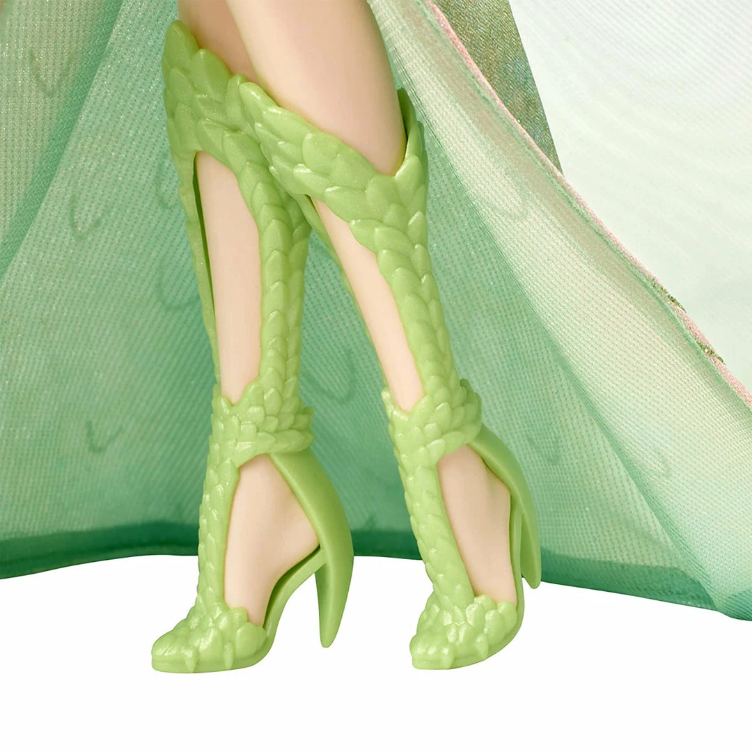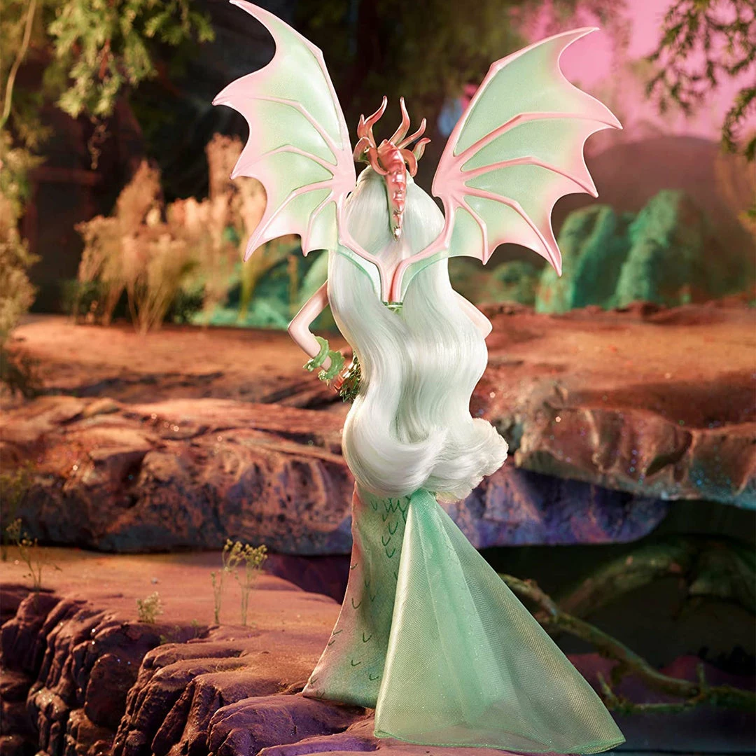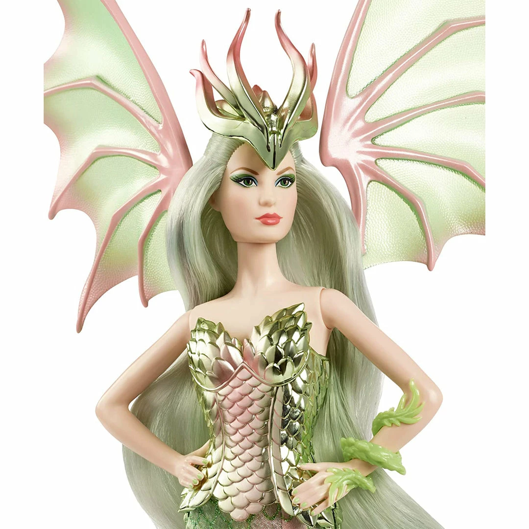 Behold the third and final doll to enchant the Barbie® Mythical Muse™ Series. Dragon Empress™ Barbie® doll is a bold, statuesque beauty with a dramatic wingspan. She wears a scale-detailed bodice in metallic mint-green and pink ombre. Beneath it is a glittered, scale-printed skirt with a slit that reveals her pearlescent, heroic heels. Her headpiece, in matching pastel ombre hues, crowns her cascading fantastical hair. A dragon-inspired cuff coils her arm, completing the look. Poised to take flight to a distant land, Dragon Empress™ Barbie® doll makes the perfect gift for collectors and fantasy lovers. Includes doll stand and Certificate of Authenticity. Gold Label Collection. Doll cannot stand alone. Colors and decorations may vary.