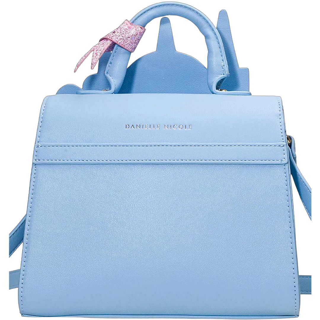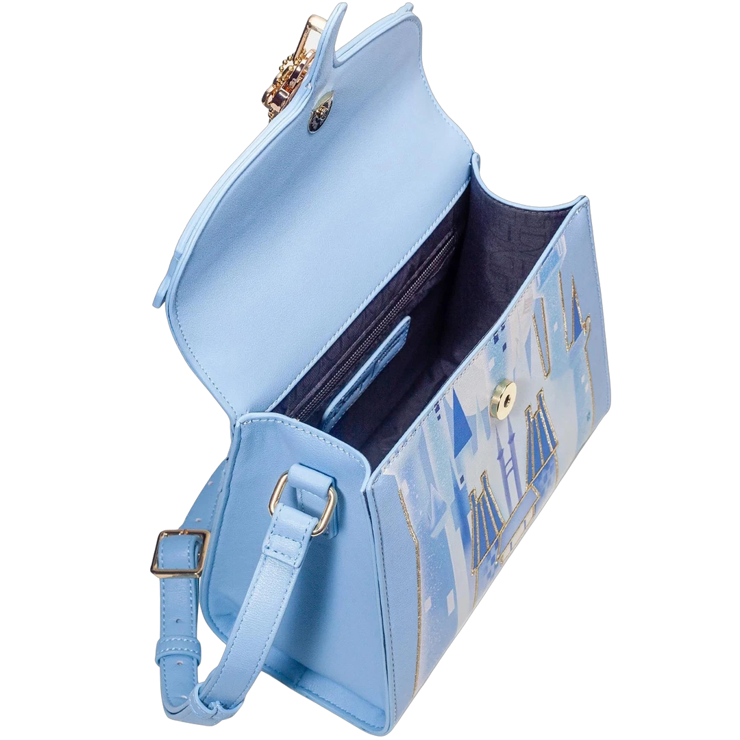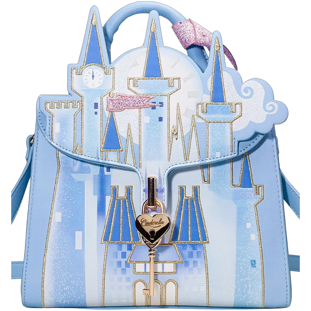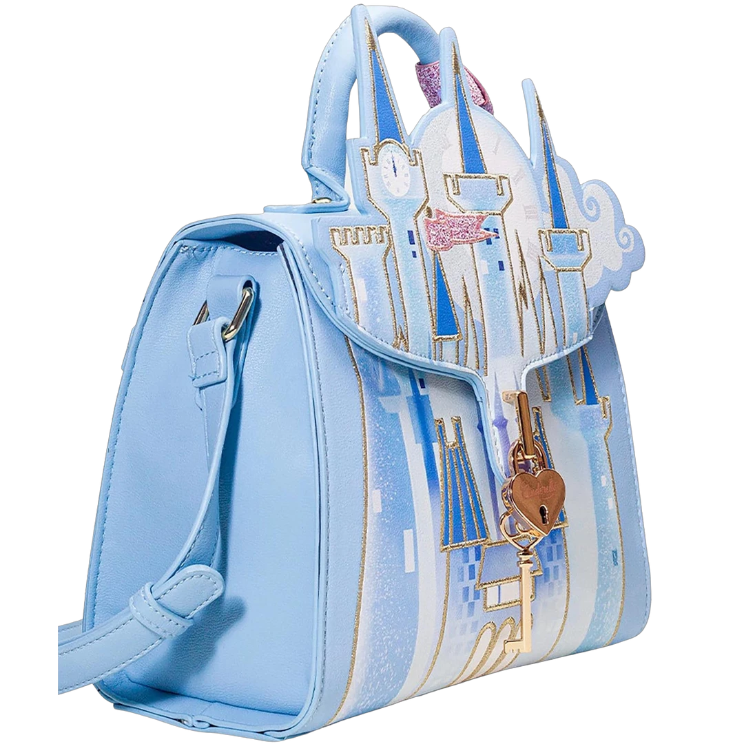 You are the main character of your very own fairytale when wearing this crossbody, inspired by Cinderella’s royal kingdom. A vision of fantasy and dreams; designed in a sky blue base with a 3D die cut castle on the flap, and a 3D pink glitter flag on the handle. A gold embroidered outline elevates this statement piece, sure to steal your heart. Complete with a gold Cinderella heart locket and key dangle, don’t miss out on collecting the bag of your dreams.