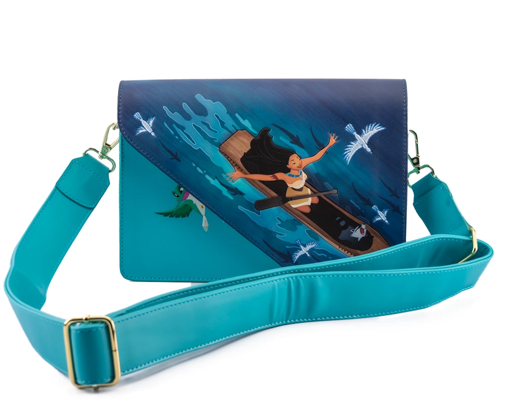 Capture a glimpse of the beauty of nature with Loungefly’s Pocahontas Just Around the Riverbend Crossbody Bag. Pocahontas canoes down the river with Meeko and Flit across the front of this cool blue bag. It’s a beautiful accessory to bring into your Disney wardrobe.