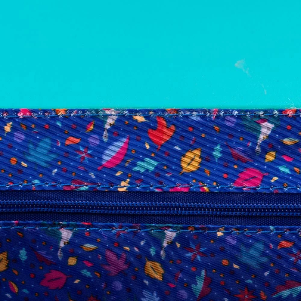 The Loungefly Pocahontas Just Around the Riverbend Crossbody Bag is made of vegan leather (polyurethane). Bag has an adjustable shoulder strap (detachable), sturdy metal hardware, and features printed details. Take note of the coordinating pattern of the inside lining fabric.