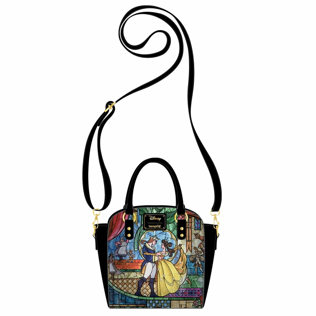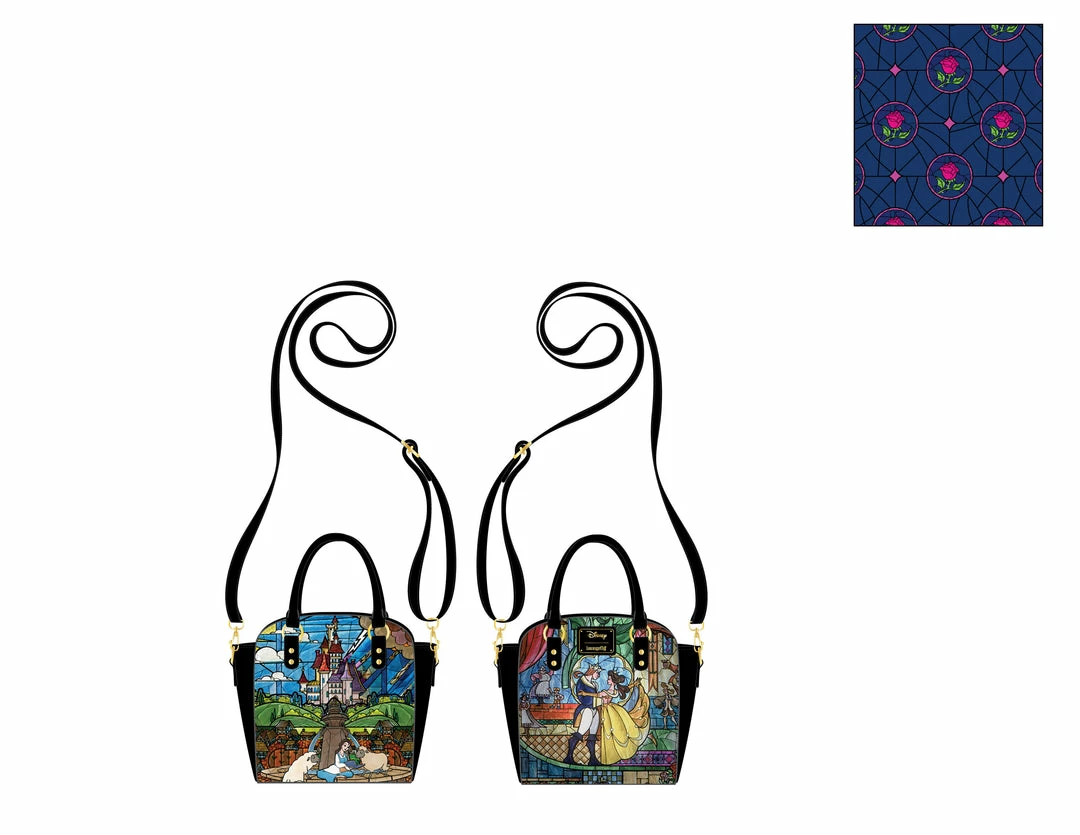 Celebrate the 30th Anniversary of Disney’s Beauty and the Beast with the Loungefly Disney Beauty and the Beast Belle Castle Crossbody Bag! It’s designed to look like stained glass windows and features vibrant colors and intricate detail. The front shows Beast’s castle with Belle reading at the fountain. The opposite side of the bag shows Beast transformed back into his princely visage, dancing with Belle in her yellow gown. Any royal subject would love to have such a beautiful accessory to their regal wardrobe.