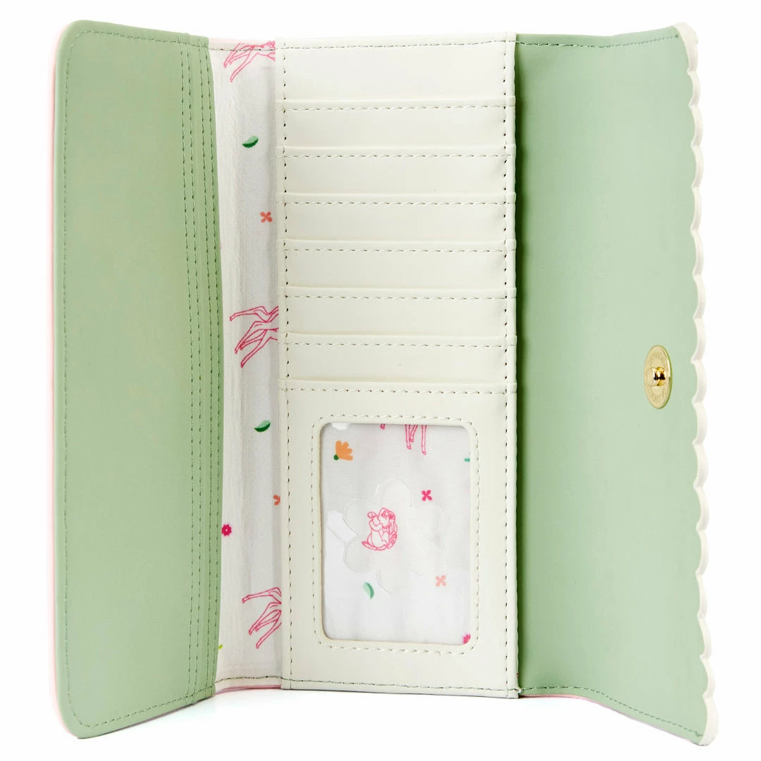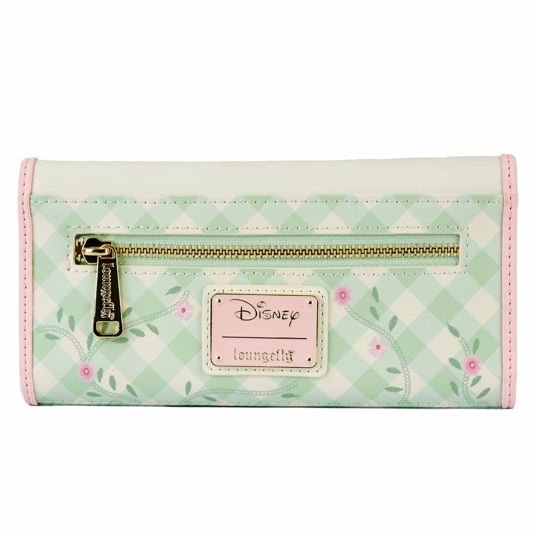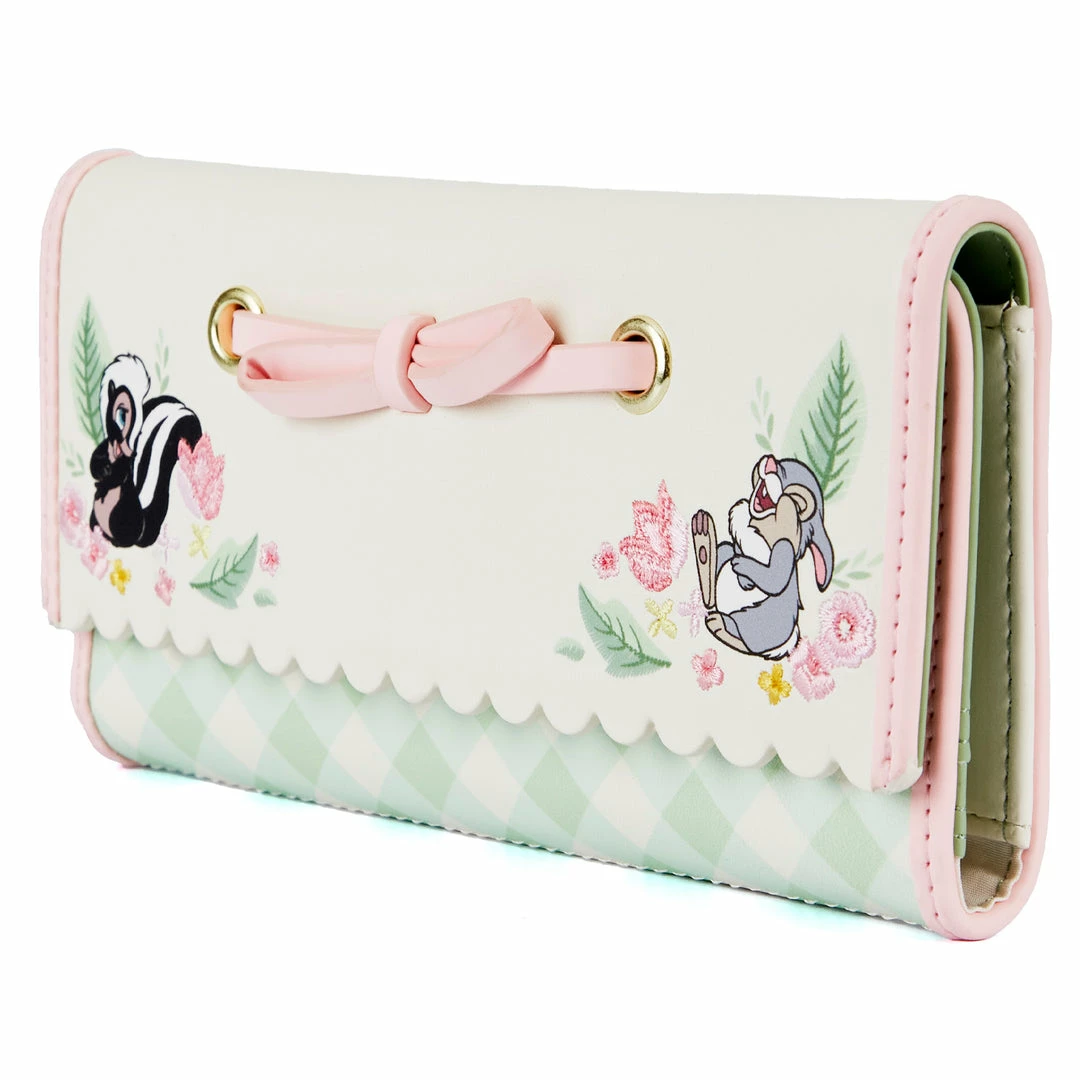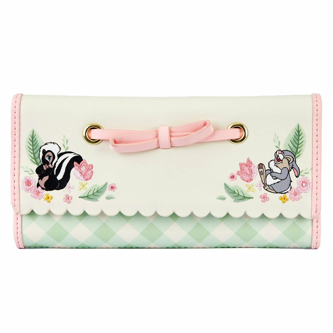 Embark on rejuvenating spring escapades Bambi and friends with the Bambi Springtime Tri-Fold Wallet! The design features Flower, Thumper, wildflowers, and foliage motifs. On the front you’ll find a decorative pink bow, as well as Thumper and Flower among ferns and wildflowers. The back has embroidered flowers over the soft green and cream-colored gingham pattern. The wallet has 6 slots for holding cards, and a clear window slot for holding your ID. It’s a delightful design that is a must have for any Bambi collection.