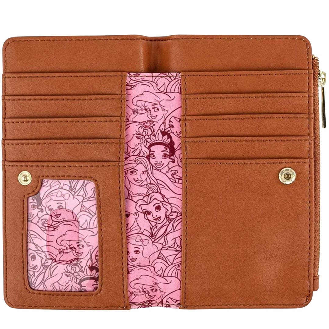 - Bifold design snap closure. Features 8 slots for cards, bill slot, ID window, and zipped coin pouch