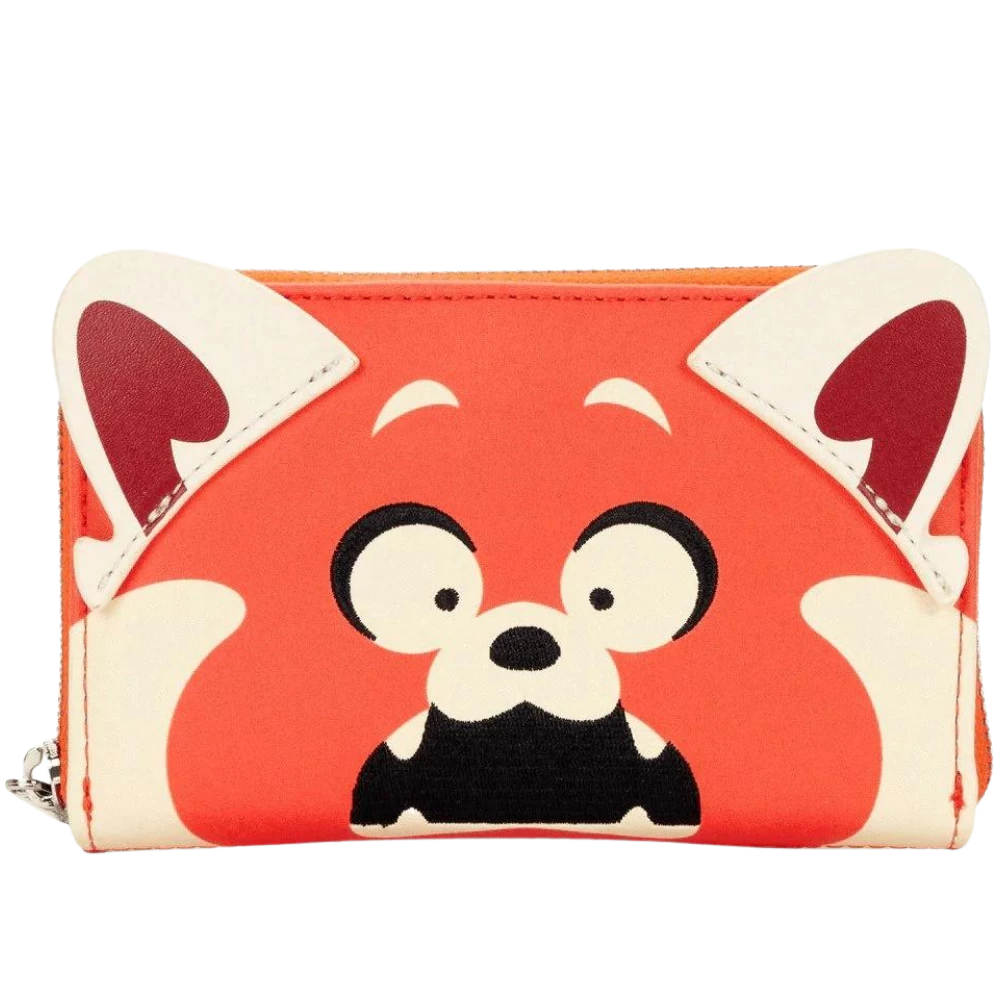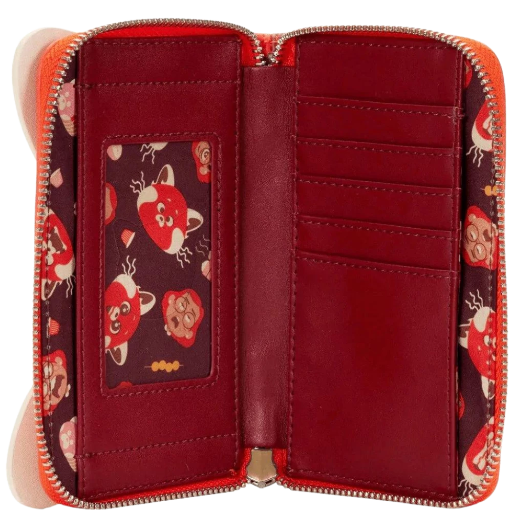 Embrace your wild side with this Turning Red Panda Cosplay Zip Around Wallet. On the front, Mei, as the Red Panda, braces for the transformation she undergoes, baring her teeth in surprise. The coordinating inside lining carries a printed motif of Mei and the Red Panda, against a dark red background.